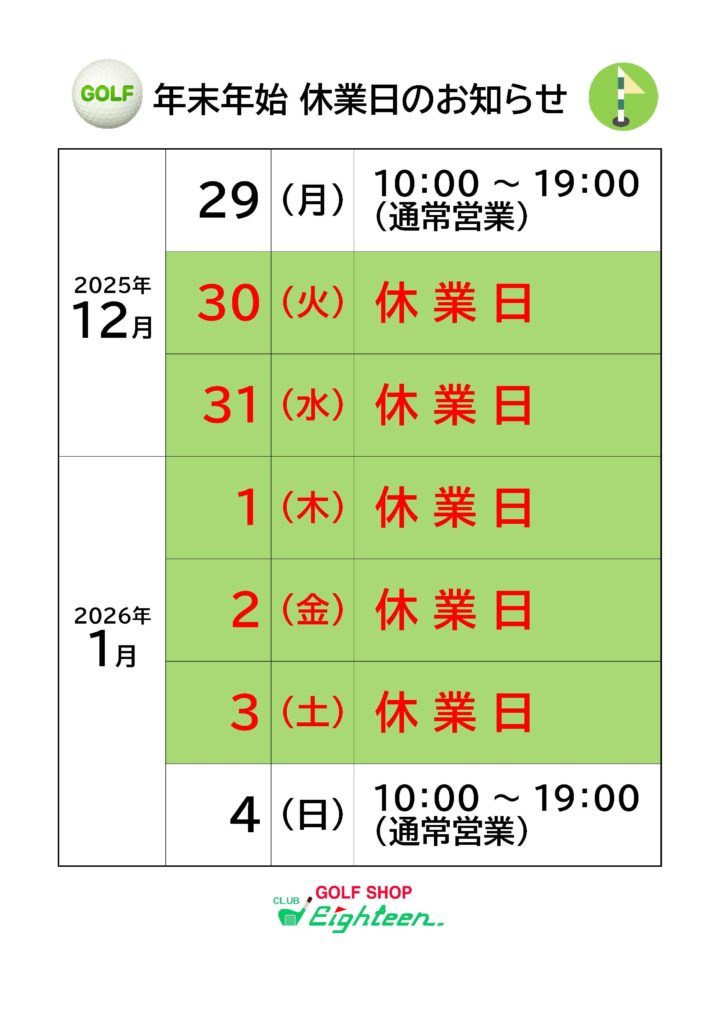 日頃よりクラブエイティーンをご愛顧いただき、誠にありがとうございます。年末年始、休業日のお知らせです。お客様にはご不便をおかけいたしますが、何卒ご理解賜りますようお願いいたします。